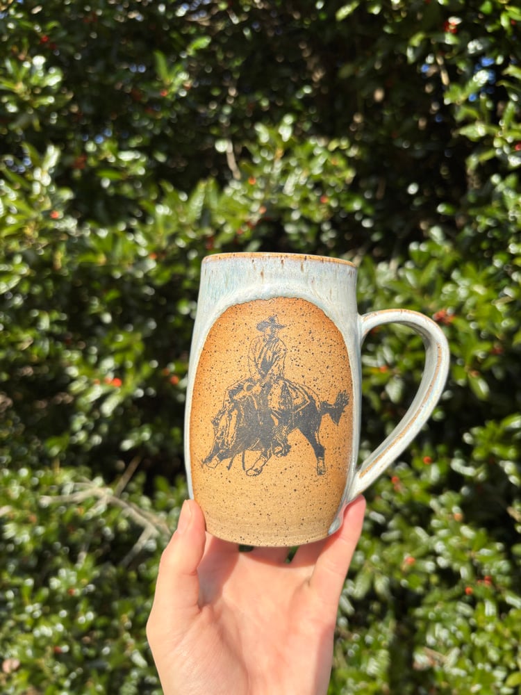 12 oz. Handmade ceramic stoneware mug with custom cowboy cutter silkscreen