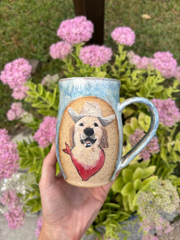 12 oz. Handmade handpainted ceramic stoneware golden retriever cowboy