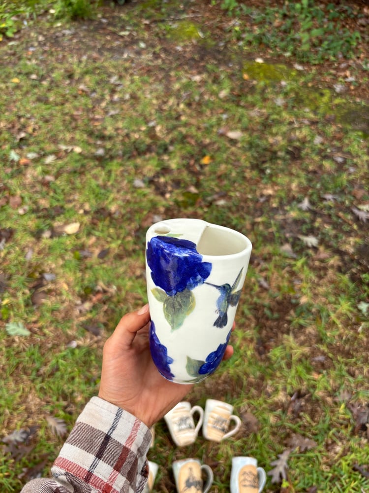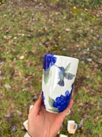 10 oz. Handmade handpainted porcelain to go cup with hummingbirds and hydrangeas.