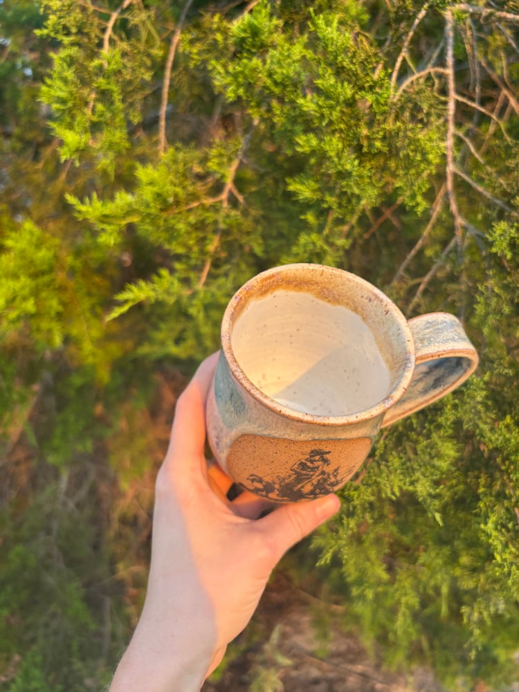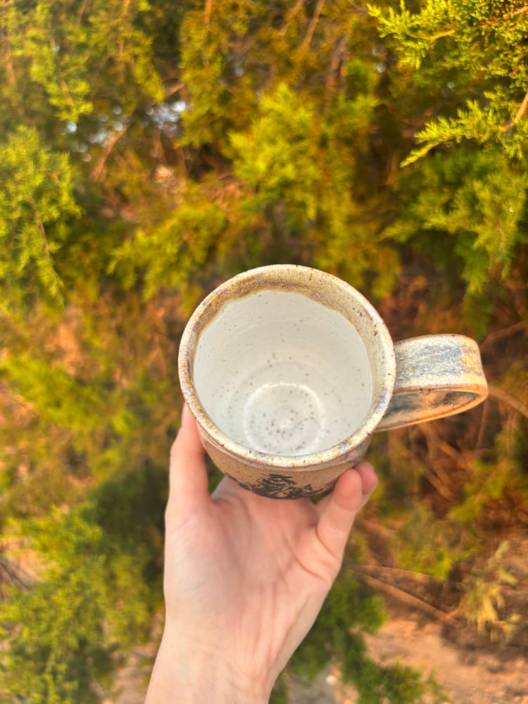 Handmade one of a kind stoneware mug, dishwasher/microwave safe with custom silkscreen